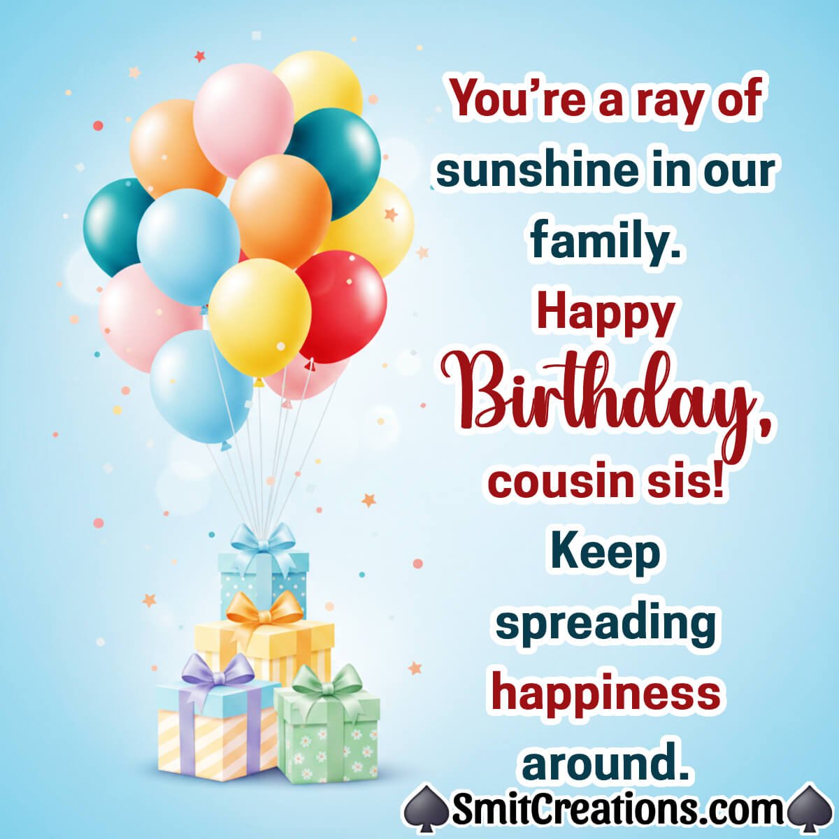 Happy Birthday, Cousin! There are some people who always know the words to bring a smile to your face. You are that person to me! Have a wonderful birthday and keep shining your beautiful light for all the world to see!