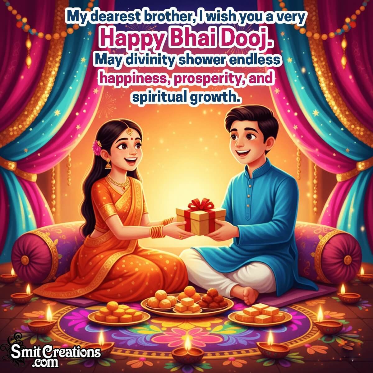 My dearest brother, I wish you a very Happy Bhai Dooj. May divinity shower endless happiness, prosperity, and spiritual growth.