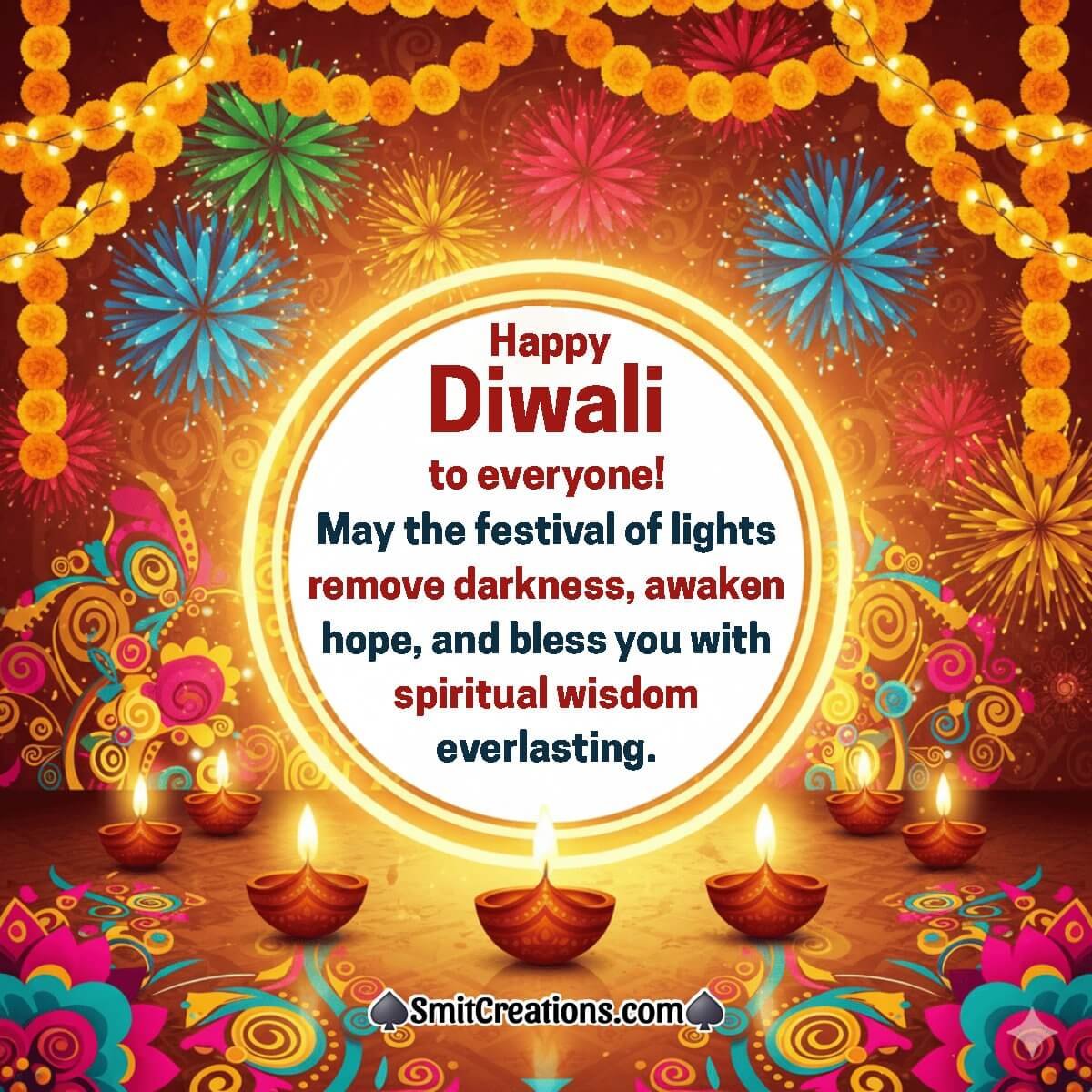 Happy Diwali to everyone! May the festival of lights remove darkness, awaken hope, and bless you with spiritual wisdom everlasting.