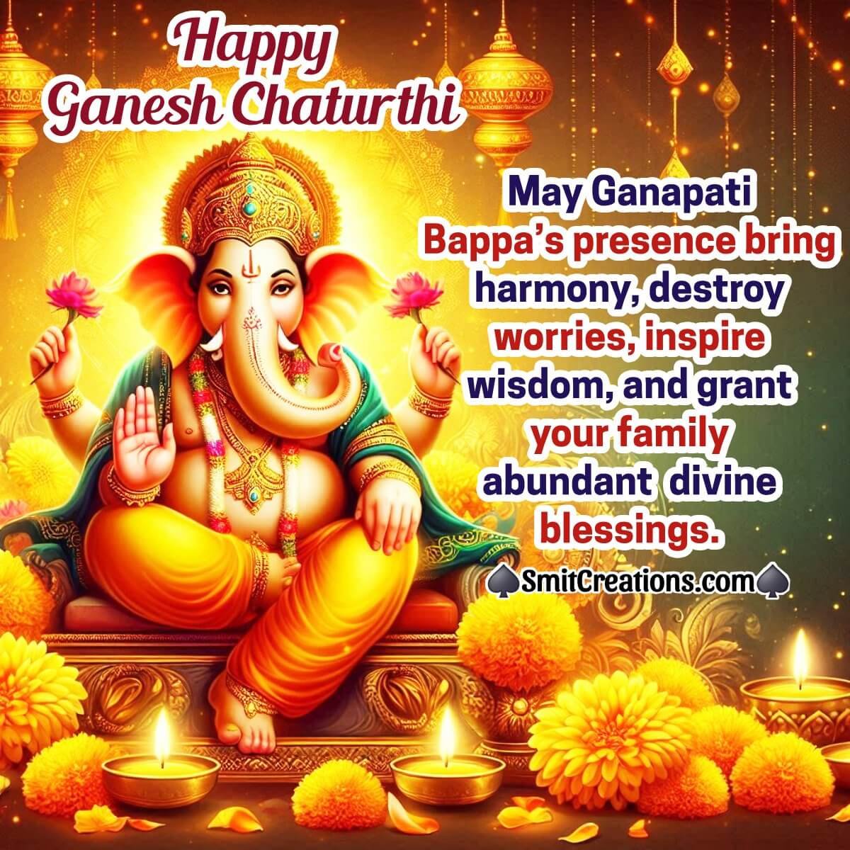 Happy Ganesh Chaturthi! May Ganapati Bappa’s presence bring harmony, destroy worries, inspire wisdom, and grant your family abundant divine blessings.
